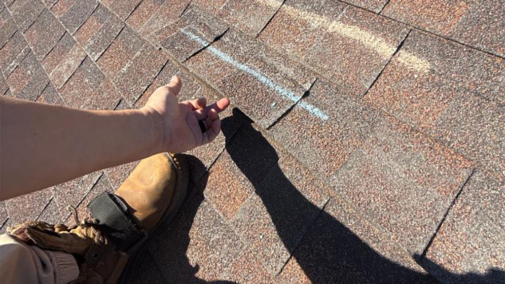 Storm damage can include missing or broken shingles, leaks, dents, punctures, or structural damage caused by hail, wind, heavy rain, or falling debris.